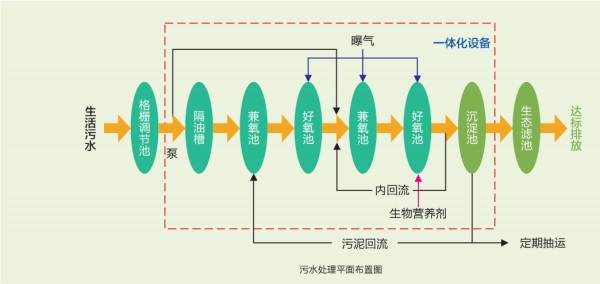 本項(xiàng)目為武鋼資源集團(tuán)程潮礦業(yè)有限公司選礦分公司生活污水處理工程。該污水處理站平常服務(wù)人口為140~160人,高峰期服務(wù)人口為200人左右,設(shè)計(jì)污水處理量為30m3/d。根據(jù)現(xiàn)有的技術(shù)特點(diǎn)及我司先進(jìn)的污水處理專利技術(shù)工藝,本項(xiàng)目采用國(guó)內(nèi)專業(yè)的生化處理技術(shù),即多級(jí)AO脫氮除磷工藝,使用一體化設(shè)備對(duì)辦公樓生活污水集中處理,保證出水水質(zhì)達(dá)到國(guó)家規(guī)定的《城鎮(zhèn)污水處理廠污染物排放標(biāo)準(zhǔn)》(GB18918-2002)一級(jí)A排放標(biāo)準(zhǔn),終水回用至選礦場(chǎng)作為綠化用水。
